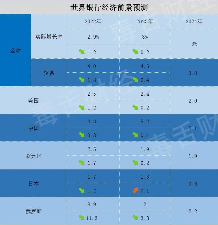 在今年4月份的时候,世界银行已经将全年全球经济增速从1月份预期的4.1%下调到3.2%,而根据最新的预测数据,2022年全年,全球的GDP增速将下调至2.9%。