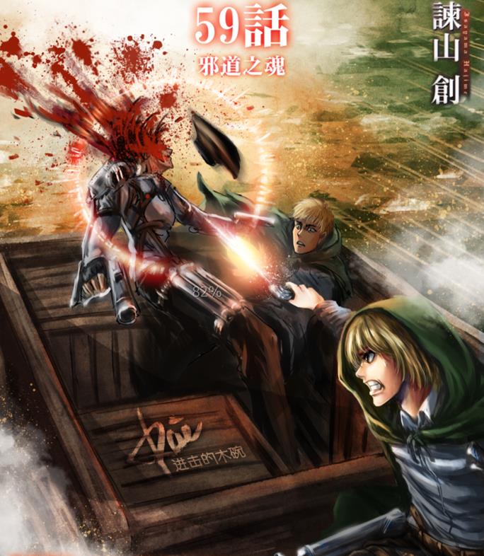 当然了,这件事发生以后我们家阿明本来就悲观的性格就更悲观了,不过也是因为这事,阿明不在懦弱了,不在胆怯了,变得勇敢了,变得无畏了。在之后打玛利亚之墙争夺战中,阿明以自己为诱饵,吸引超大型巨人的注意力,让艾伦从后面偷袭超巨,最后,作战成功!阿明却倒下了,被超巨的热气给烤熟了,然后发生了什么,我开头就就讲了。(其实漫画更新到决定团长活下来还是阿明活下来那话中,我看前面,真的认为阿明没救了,毕竟艾伦刚才一直在回忆他的过去,说明他的便当是稳的。可是,没想到,这货还是给吐了,还吐到团长嘴里去了!)