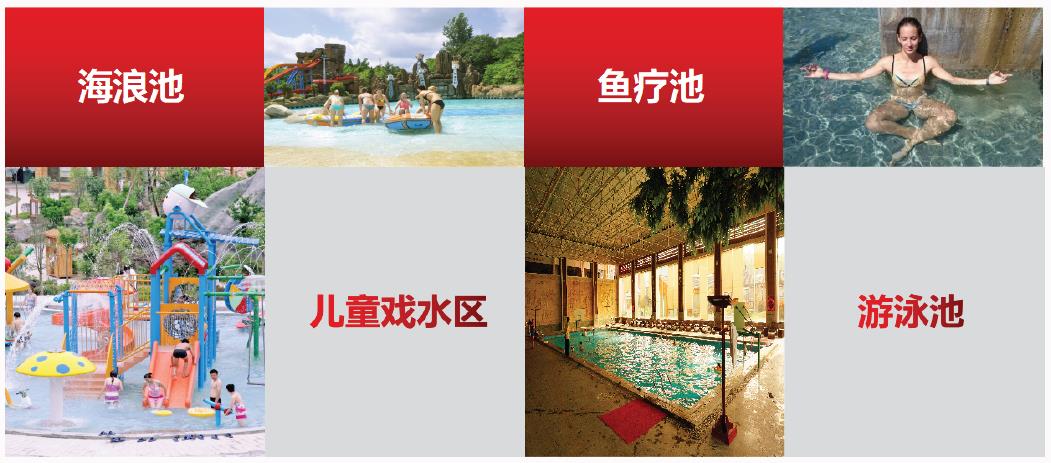 有一百多个泡池,巧妙地分布在自然环境里。一部分是异域风情的古朴野趣、温馨浪漫;一部分是利用声光电雾、幻影成像、5D影视等技术,让现实与虚拟景象结合,再现西游神话仙境。