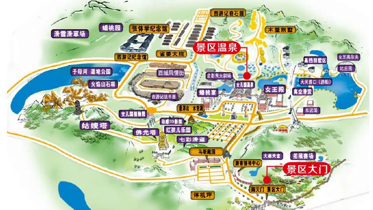 西游记公园位于随州市洪山镇温泉村,占地3900亩,按照国家AAAA级景区标准精心打造。景区由女儿国温泉、西域风情街、水上娱乐园、动物表演园、军事拓展园、农耕体验园、赛马场、高尔夫练球场、汽车越野赛场、滑雪滑草场九大主题公园组成。