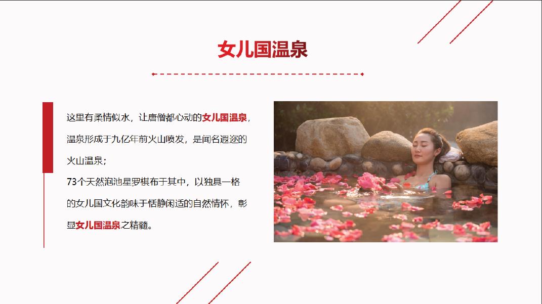女儿国温泉,形成于九亿年前火山喷发,是闻名遐迩的火山温泉,其中富含氡、氟、钙、镁、硒等40余种有益人们身心健康的微量元素。