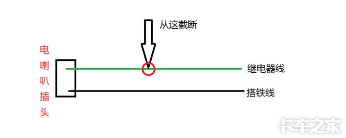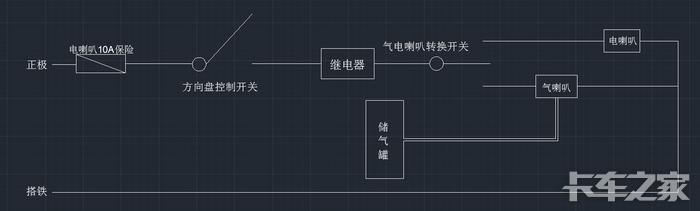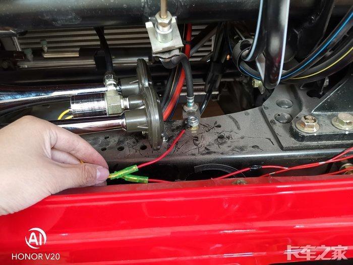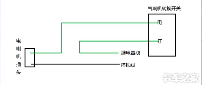从驾驶室把开关“气”的线延长出驾驶室 接在气喇叭上 气喇叭另一根线搭铁 我用子Dan头接的线