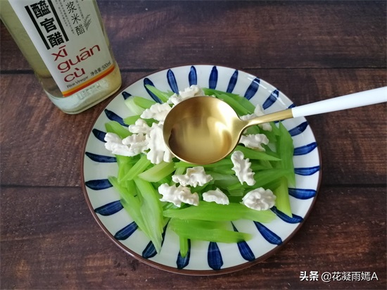 第七步:把西芹和核桃仁放入到盘子里,倒入一勺米醋,不要放颜色重的陈醋。