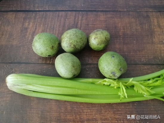 食材:新鲜核桃8个、西芹300克、醋1勺、盐1勺、白糖少许、香油1勺