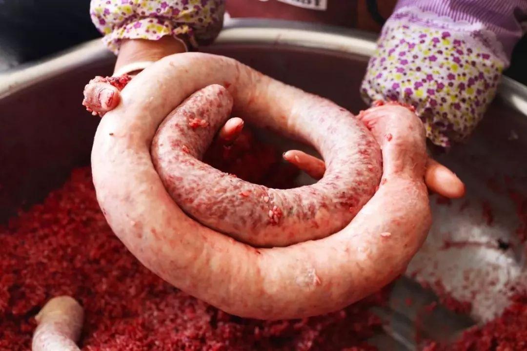 在灌肠的过程中,用巧劲将拌匀的米饭灌入洗干净的猪大肠里,一大串完好无损。