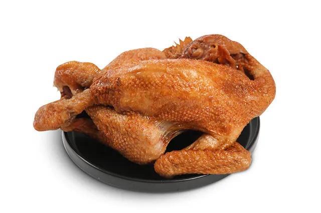 ③晾、炸、卤鸡漂、别后,白条鸡串入竹竿晾净浮水,用高浓度饴糖或蜜水沾抹鸡身,放入100度左右的油锅内翻炸(油用植物油),老、小鸡要分别炸。嫩鸡炸几分钟后捞出,呈金黄色,然后放在卤锅里卤。卤汤愈陈愈好,嫩鸡卤20分钟左右,老鸡约卤一小时。在卤鸡的同时将配料袋放入卤锅内。配料有八角、小茴香、砂仁、白芷、桔皮、辛夷、草果、三乃、良姜、肉寇、花川、丁香等十几种香料。