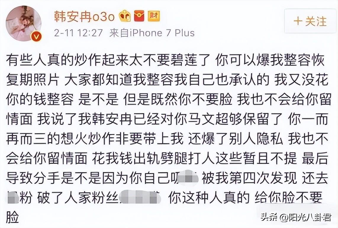为了维持自己的形象,韩安冉立马发文反击,除了否认爆料之外,甚至还主动爆料马文超是小白脸,吃软饭,甚至还有“家暴”倾向。