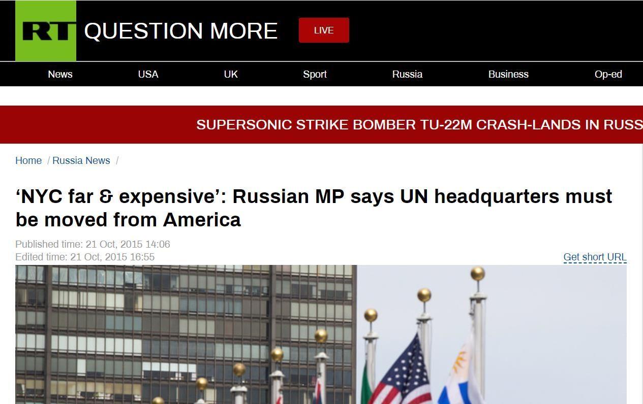 俄罗斯的一位议员,在国家杜马(即议会)上的一次发言,提出“联合国总部应该搬离美国。”这位俄议员维亚切斯拉夫·尼科诺夫(Vyacheslav Nikonov )的理由是:“联合国总部的迁址,应该反映出金砖国家(BRICS)等新兴经济体影响力的日益重要。”
