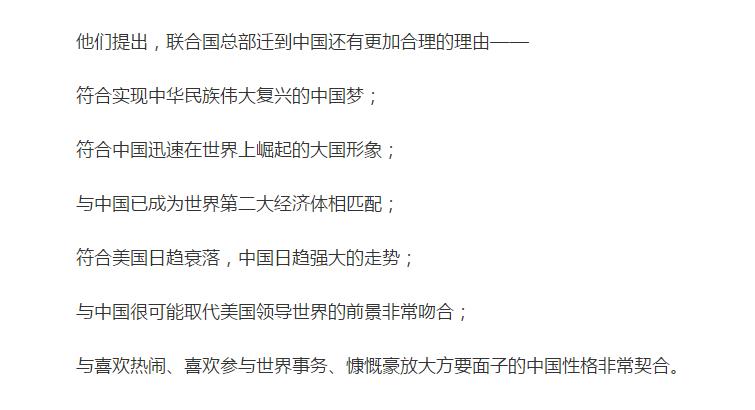 不仅如此,文章中还称“将联合国总部从纽约迁往中国或巴西”是俄罗斯国家杜马副主席、“公正俄罗斯党”主席列维切夫的主意,原因是这样符合中国迅速在世界上崛起的大国形象......
