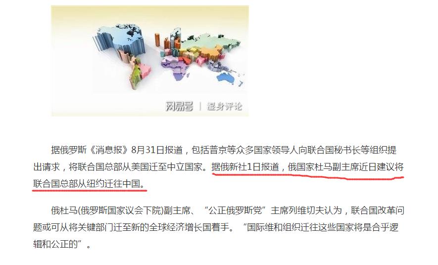 文章还有板有眼地引用:据俄罗斯《消息报》8月31日报道,包括普京等众多国家领导人向联合国秘书长等组织提出请求,将联合国总部从美国迁至中立国家。据俄新社1日报道,俄国家杜马副主席近日建议将联合国总部从纽约迁往中国。