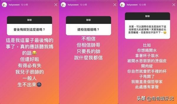 然而在昨日呆宝静也在限时动态中回复网友的提问,其中有一位问到「会后悔嫁到这么远吗?」,呆宝静也坦承这是她这辈子最后悔的事,提到:「真的应该听我妈的话,但还好啦有得必有失,我儿子很帅的,一般人生不出来」,展现出相当乐观的态度。接着也有网友提问「呆宝,可以请问你是怎么放的下这么久的感情吗?」,而她也用热水与杯子的理论来解释:「比如,你想喝开水,拿着杯子装水,被开水恶狠狠地烫个皮开肉绽,你自然就会把手里的杯子甩开了」,此番言论也令许多粉丝感到非常心疼。