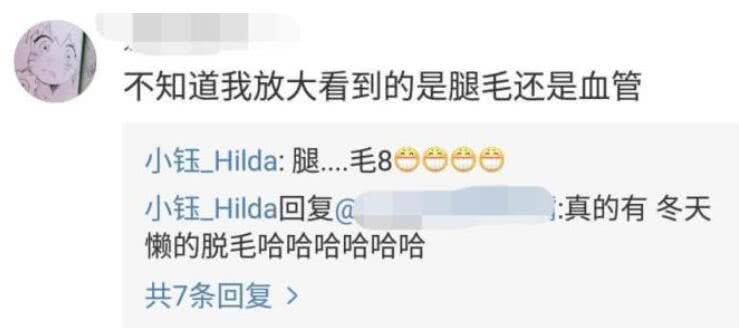 而小钰反而没有半点羞涩,直接表示这是腿毛。并且表示冬天太冷,懒得脱毛了。这么大方承认好圈粉啊,感觉小钰的性格真是活泼可爱呢。