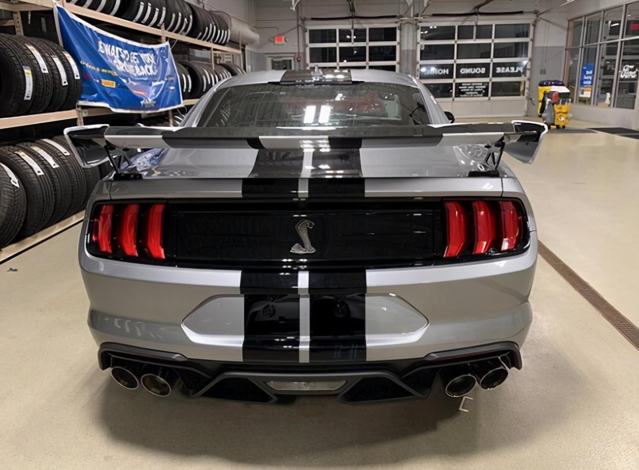 现身的实车采用了“战斗灰”作为车身颜色,引擎盖上配有跑车的经典双条纹拉花,前脸配有大量的运动套件,大尺寸中网格栅上带有“眼镜蛇”车标,两侧大灯组为凹陷设计,双侧大运动格栅配有下侧黑色装饰雾灯,展示出和普通野马不一样的运动攻击感。