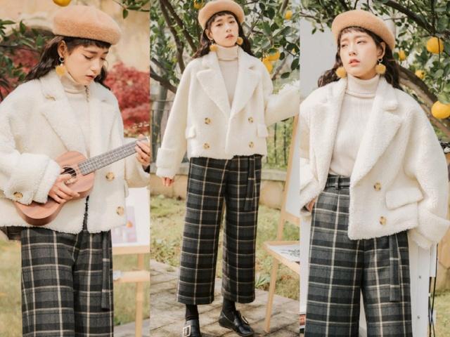 搭配1、羊羔绒米白色大衣+格子休闲裤