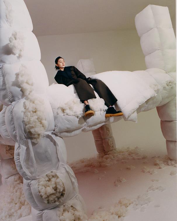 这一张大片又与上面的截然不同,这件造型的版型更加oversized一些,颇有男性气息,领口剪裁以及衣身版型,肩部还做了刺绣设计,有股海军风的气息,将低调的奢华感展现得淋漓尽致。