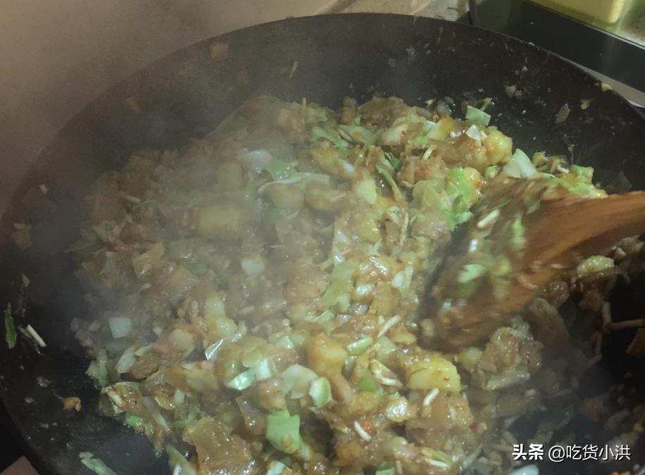 2.准备好卤油(也可以食用油和猪油代替,但味道差点),下入锅中,大火烧之后下入辣椒面炸出香味,然后下入洋芋翻炒,再下入切好之后的泡萝卜、包菜、折耳根等等,出锅之前加入佐料调味即可。