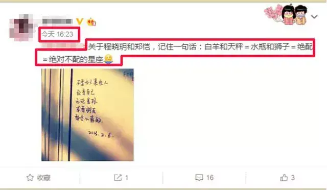因为,他发布这一消息的时间,是16:23。这个时候,郑恺还没有公布分手的消息,而11分钟之后,也就是16:34,郑恺才宣布了这样的一个消息。而郑恺出生于4月17日,是白羊座,而程晓玥则出生于10月19日,天枰座。从这来说,这名星座爱好者还是有点厉害的,不管其只是巧合还是什么原因,最起码这一次,他的推测是完全准确的。而给人一种特别般配感觉的郑恺与程晓玥,最终也是分手了。当然,这并不是说,煮娱君推崇星座学。只能说,很多东西,你可以选择相信,但千万不要盲从。因为,一个人的性格,肯定不完全是星座研究所能全部呈现的,还有很多外部环境的影响。