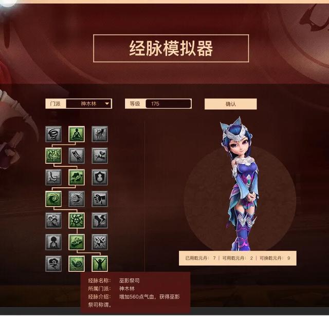 接下来我们来看看神木林的奇经八脉点法。现在神木林的奇经八脉经过改版后,提高了生存。我们先来看看任务的点法。法身-追击-劲草-神木-纯净-滋养-风卷残云-通天法王,因为大招没奔巫影祭司去,生存能力有点欠缺。但是如果是贫民五开玩家,在配上全魔的话,伤害还是很可观的,没有两全齐美的东西存在,舍弃了一样,只能承受因舍弃带来的弊端了,不过配上高血腰带属性还是不错的。