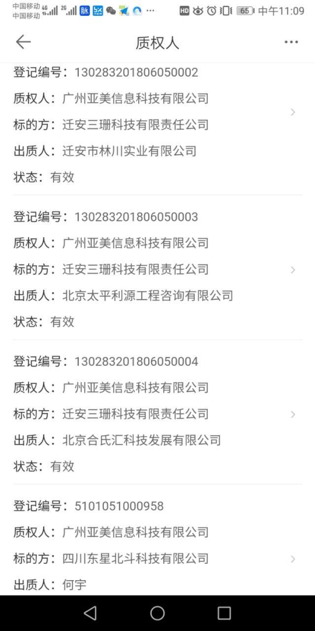 找到APP(天眼查/企查查)搜索广州亚美信息科技有限公司,成立时间2011年,注册资本2000万,产品主要有AI智能车镜和OBD智能传感器(车智汇)。股东信息、高管信息、股东变更信息、社保缴纳人数、发明专利信息、法院裁判文书、质权人信息截图如下: