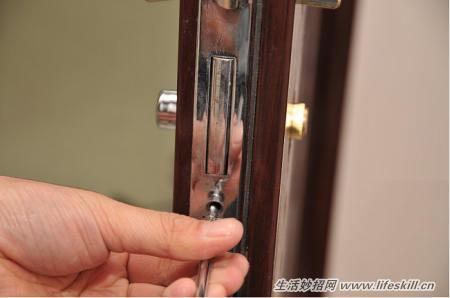 再用螺丝刀卸掉锁舌附近的锁芯固定螺丝,这个螺丝比较长,耐心点拧