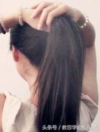 第一步:首先黑色长直发女人将头发全部聚集在发旋靠上的位置,用梳子将头发梳理滑腻,双手握住长发,让其不散开。如图所示。