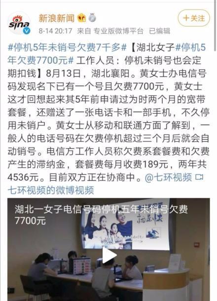 近日,湖北一女士手机号停机5年未销号,如今欠下7700元。