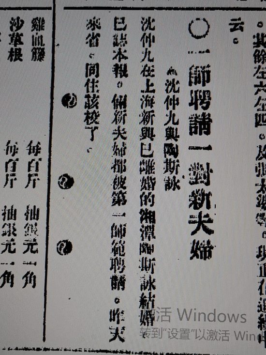 一九二三年三月十六日,《湖南大公报》第七版,一则报道:沈仲九在上海新与已离婚的湘潭陶斯咏结婚,已誌本报。俩新夫妇都被第一师范聘请,昨天来省,同往该校了。