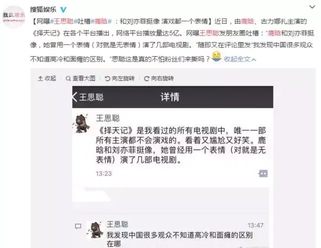 说到鹿晗,最近他主演的《择天记》正在热播,却引来了王思聪的吐槽,网曝王思聪发朋友圈吐槽:“鹿晗和刘亦菲挺像,她曾用一个表情(对就是无表情)演了几部电视剧。”随即又在评论里发“我发现中国很多观众不知道高冷和面瘫的区别。”