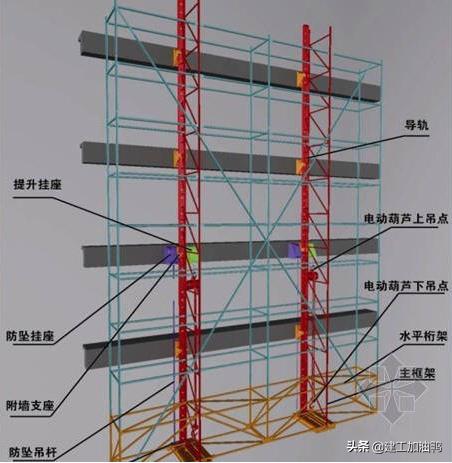 1)集成附着式升降脚手架主要由架体系统、附墙系统、爬升系统三部分组成。
