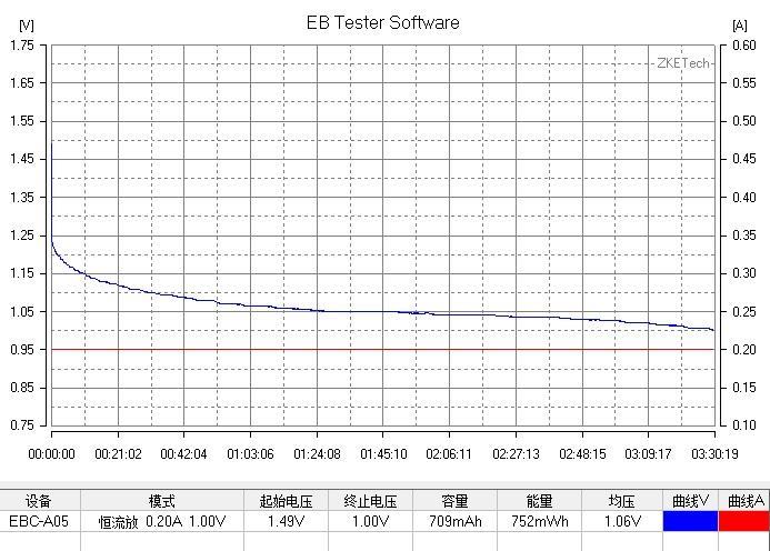 测试结果 709mAH,如果使用100mA恒流放电,会有更大容量。