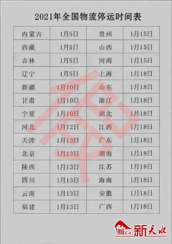 记者看到,这则“2021年全国物流停运时间表”上面显示,内蒙古、西藏、吉林、辽宁四个省快递物流1月5日停运;新疆、甘肃、宁夏1月10日停运;河北1月12日停运;天津、北京、陕西等地1月13日停运……那么这个消息是真是假?