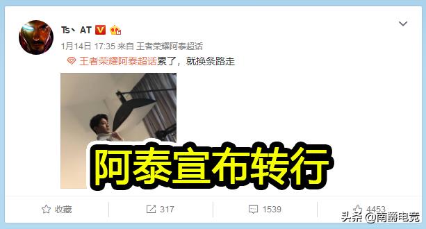 阿泰转会到TS之后,境遇并不好,一开始虽然能首发出场,但是上场就输,备受诟病。赛季过半之后,阿泰连出场的机会都没了,替补席也见不到他,网友们都好奇他去哪里了。之前就有传闻称,阿泰想要转行当解说或者教练,但是一直是传言。终于,阿泰自己在微博宣布,累了,就换条路走。阿泰的意思也很明确了,当选手累了,不想再打了,以后会换一个行业,至于是不是解说或者教练,相信很快就会有消息。