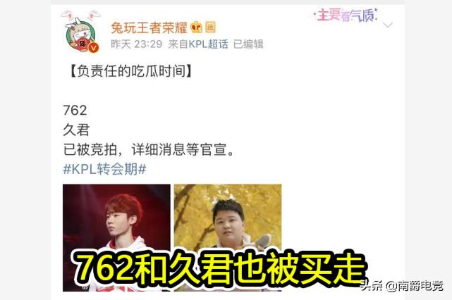 除了久诚以外,还有两位选手也已经被买走。一位是WE俱乐部的762选手,WE去年刚刚卖掉了队内大腿绑兔,今年虽然成绩很差,但是762的表现可圈可点,没想到又被卖掉。WE的老板SKY在直播的时候,还豪言俱乐部会买人努力改善成绩,没想到上来自废一臂,看来春季赛,WE也没什么希望了。另外Hero的久君也转会成功了,久君大家都非常熟悉,并不是因为他强,而且因为秋季赛的拒绝握手事件,当时eStar战胜了Hero,但是久君却拒绝了无铭的握手请求,还假装没看到,赛后也被网友们疯狂吐槽,那次事件之后,久君的状态也一落千丈,没想到他也能转会成功。