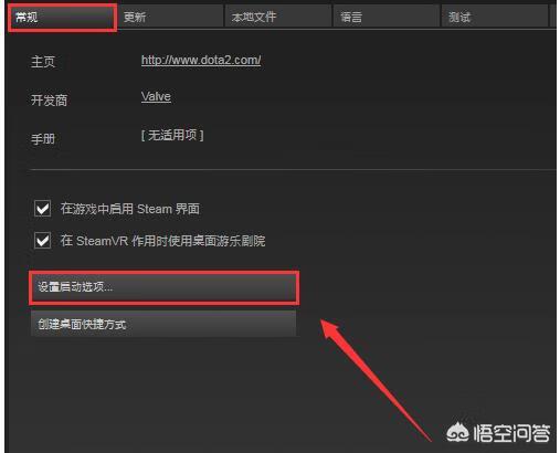 4、打开dota2属性设置面板后,选择常规,点击设置启动选项,如图所示
