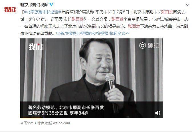 原北京市常务副市长,张百发同志,于2019年7月5日5时35分去世。享年84岁。