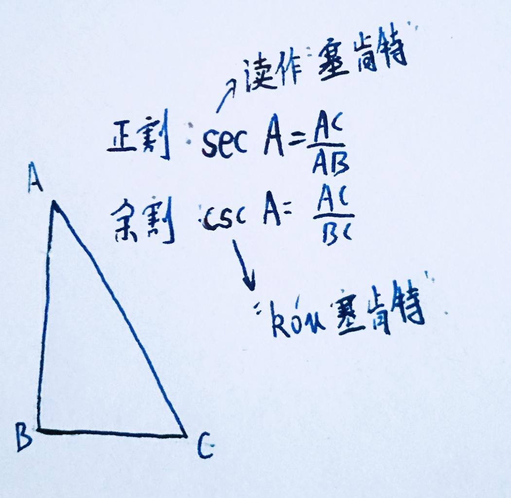 大家想一下,我们已经学过了那么多三角函数了,有正弦,有余弦,有正切,还有余切(只做了解要求就是正切的倒数)。那么还有哪些比例没有定义呢?是不是还剩下一个斜边比直角边。你可能会说那正弦和余弦不就是吗?注意“比”字就像除号一样,只能是用前面的去比上后边的。正弦和余弦他们是用直角边比斜边的。
