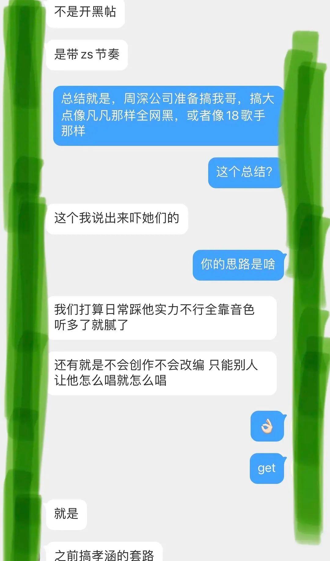 粉丝还组建了很多官方小组和微博账号,披皮为华晨宇控评引导舆论,华晨宇的工作人员也与粉丝有着密切联系,引导指挥粉丝。粉丝还有组织的攻击、抹黑华晨宇的竞争对手周深和张韶涵,而这些还只是冰山一角……