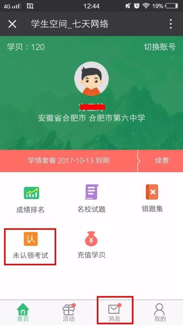 随后会进到平台首页(如下图),这时必须先去领取考試,点一下图上鲜红色框中的按键,“未认领考试”或是“消息”