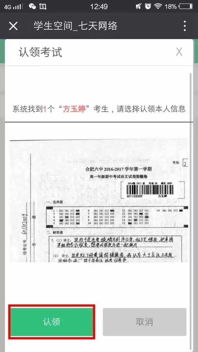 在点一下领取的情况下,留意学生信息内容,有时会出现同名,很有可能会寻找一个之上的学生,必须父母依据学生班集体、笔记开展领取(如下图)