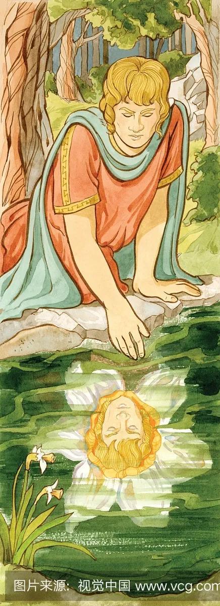 纳西瑟斯看见了Echo,认为森林女神是一个轻浮的女子,不屑一顾,走掉了。Echo悲痛欲绝。天帝知道这件事后,想惩罚这位美貌且高傲的纳西瑟斯也爱而不得。天帝让他在河边饮水时,看见自己的倒影时爱上自己的倒影,于是他日复一日在河边看着自己的倒影不愿意离开,久而久之,化作一朵白色的水仙花。