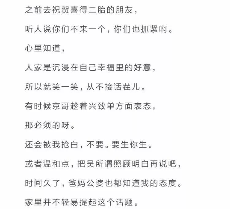 去看望二胎产妇,朋友会热心地劝自己再生一个;丈夫也许不大管孩子,但他用各种机会明示暗示自己,想有一个四口之家;家里的老人,软的硬的都来的也不少见。