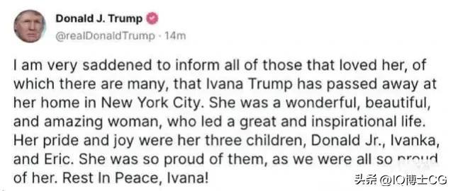 伊万卡在推特上表示,她“对母亲的去世感到心碎”,并补充道:“母亲才华横溢、魅力四射、激情澎湃、幽默至极。她生活得充实——从不放弃欢笑和跳舞的机会。我将永远想念她,并将永远铭记在心。”