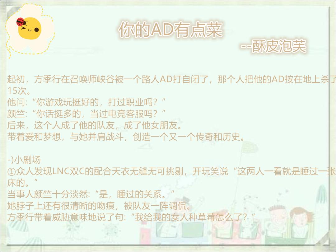 ps:1. 双职业选手,并不高冷的LPL顶尖中单x不甘认输的AD小姐姐。(菜的是男主的AD),女主前期助教。