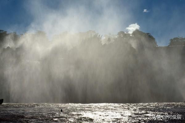 当我们走近距离伊瓜苏瀑布还有几公里的时候,就已经听到了伊瓜苏大瀑布水流的轰鸣声,而在我们进入伊瓜苏国家公园后,几乎就听不到相互之间的说话声了,水声震耳欲聋,溅起的水花飞得漫天皆是,一派壮观景象。