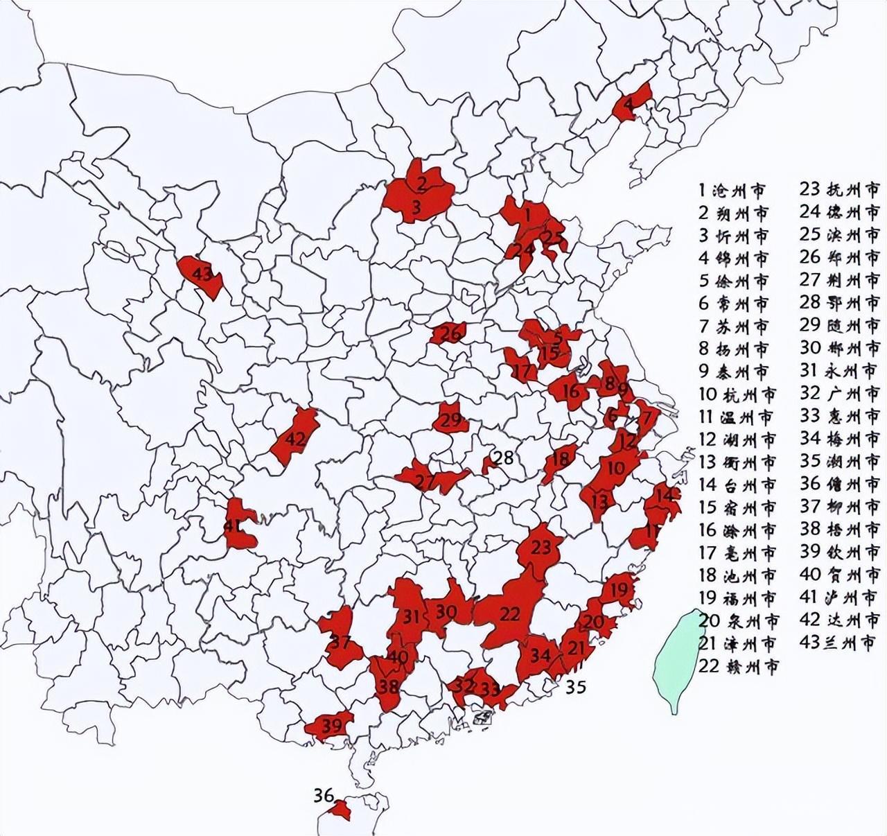 江苏省:苏州、泰州、扬州、常州、徐州。浙江省:杭州、台州、温州、衢州、湖州。广西壮族自治区:柳州、梧州、钦州、贺州。广东省:广州、惠州、梅州、潮州。安徽省:宿州、滁州、池州、亳州。福建省:福州、泉州、漳州。湖北省:鄂州、随州、荆州。江西省:赣州、抚州。山东省:滨州、德州。湖南省:郴州、永州。四川省:达州、泸州。山西省:忻州、朔州。河南省:郑州。河北省:沧州。辽宁省:锦州。甘肃省:兰州。海南省:儋州。