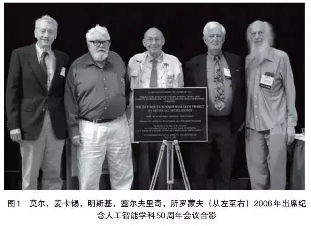 1956 年夏季,年轻的数学家和神经学家明斯基与数学家和计算机专家麦卡锡(John McCarthy)、IBM 公司信息中心主任朗彻斯特(Nathaniel Rochester)、贝尔实验室信息部数学家和信息学家香农(Claude Elwood Shannon)等共同发起组织,邀请IBM公司的莫尔(More)和塞缪尔(Samuel)、美国麻省理工学院的塞尔夫里奇(Selfridge)和索罗蒙夫(Solomonff)、兰德公司的纽厄尔(Newell)和卡内基梅隆大学的西蒙(Simon)共10人,在达特茅斯大学(Dartmouth College)举办了一个长达2个月的人工智能夏季研讨会,认真热烈地讨论用机器模拟人类智能的问题。会上,正式使用了人工智能这一术语。这是人类历史上第一次人工智能研讨会,标志着人工智能学科的诞生,具有十分重要的历史意义,为国际人工智能的发展做出重要的开创性贡献。图1为1950年夏出席达特茅斯会议的部分代表于50年后共同纪念人工智能学科诞生50周年合影。
