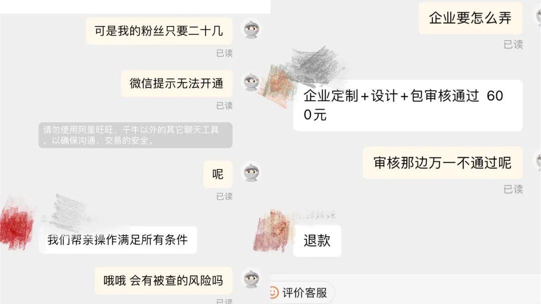 需要说明的是,可能是受平台限制的影响,部分商家已不提供企业端开通权限上的服务,至于所谓的审核工作,主要是帮助企业客户修改封面以通过平台审核,并收取五六百元不等的费用。