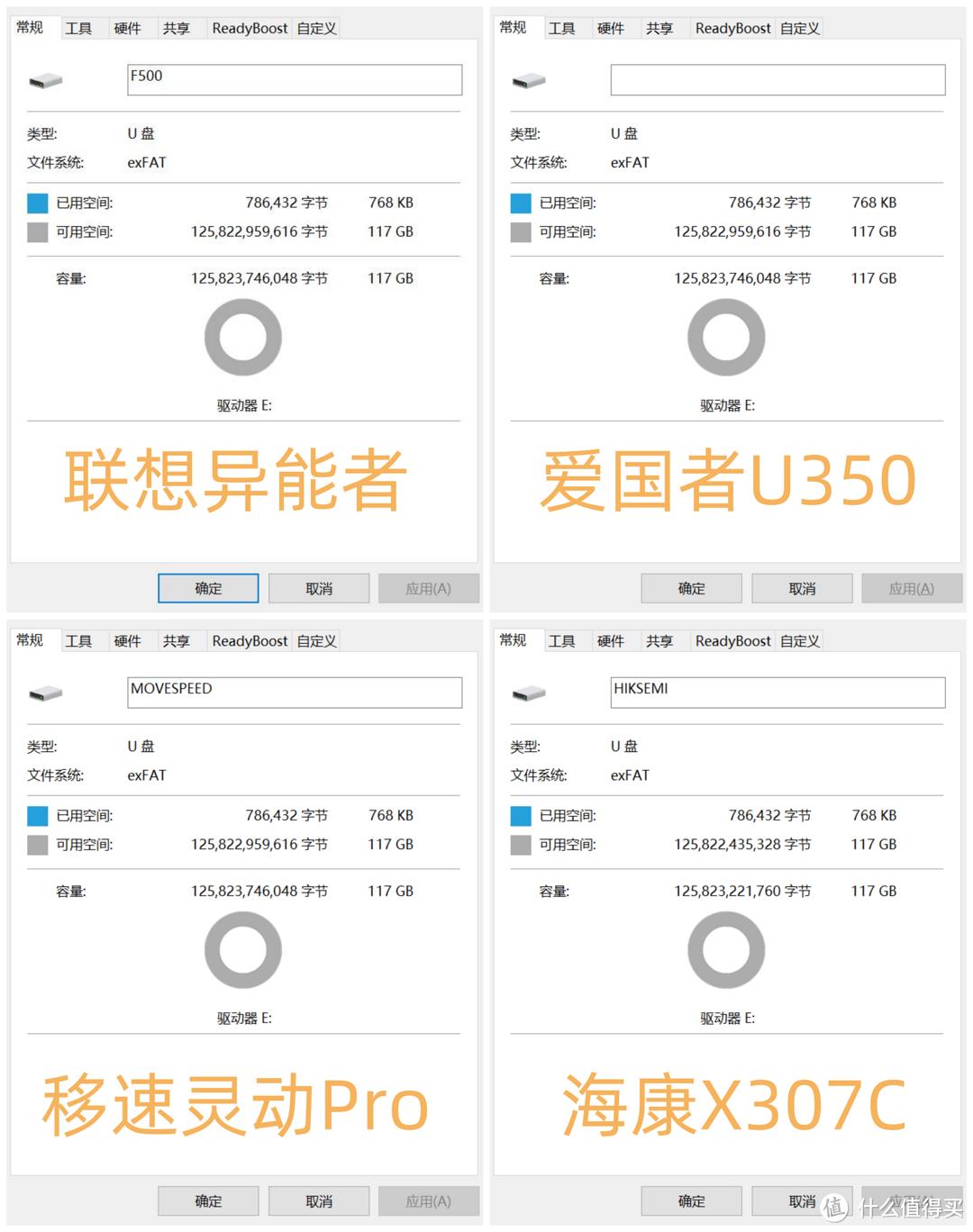 进入电脑后我们先将四款U盘统一进行格式化,然后看看大家的实际容量如何,结果四款U盘的可用空间与已用空间惊人的一致,已用空间都是768KB,可用空间117GB。