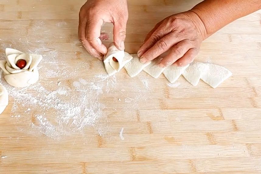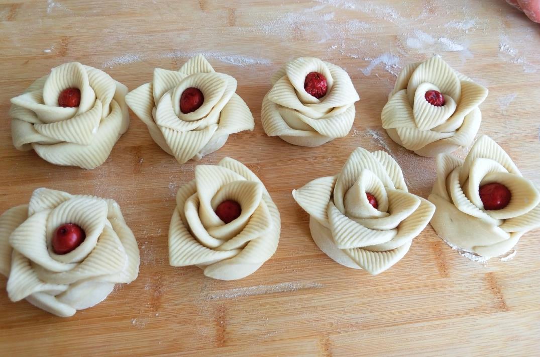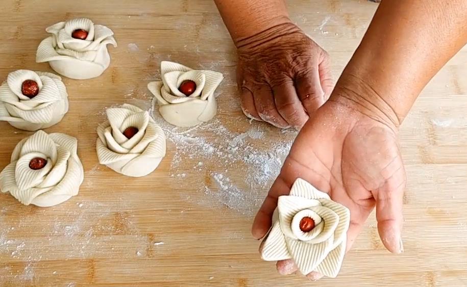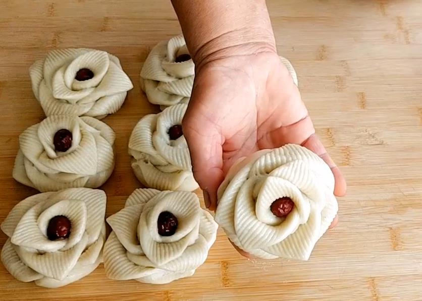 卷好之后稍微调整一下花瓣 我们的花朵枣花馒头的生坯就做好了
