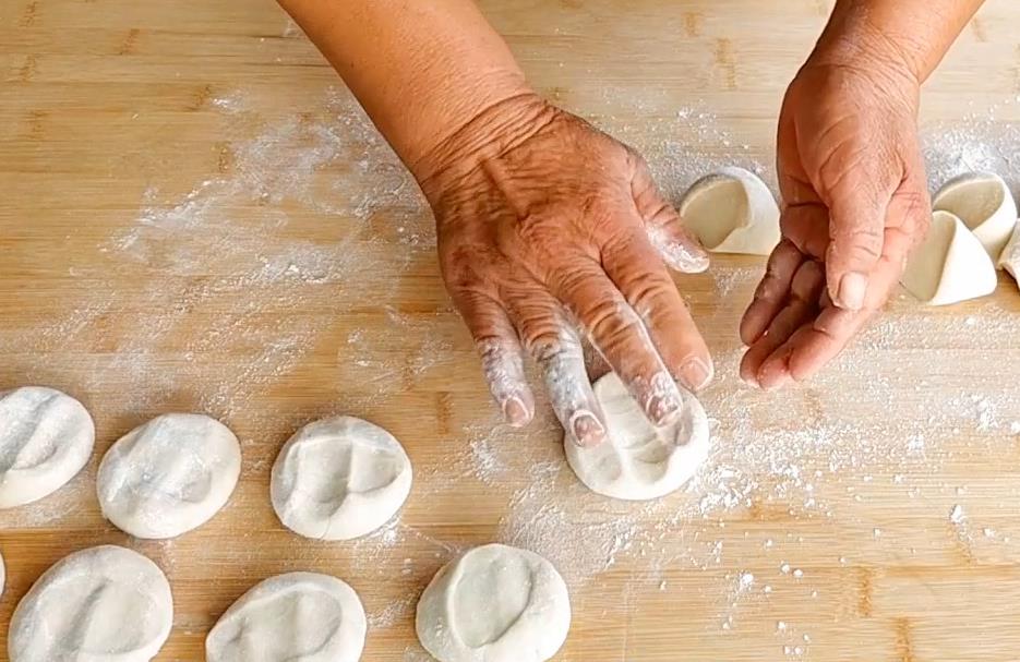 撒上一些干面粉 用手把这些面剂调整一下 把它们按扁备用